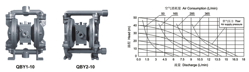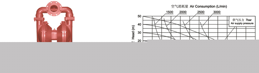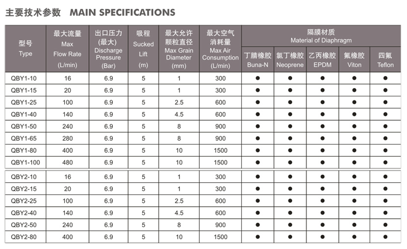 1、不需灌引水,吸程高達(dá)5m,揚(yáng)程達(dá)70m,出口壓力≥6bar。2、流動寬敞,通過性能好,允許通過最大顆粒直徑達(dá)10mm。抽送泥漿、雜質(zhì)時,對泵磨損甚微。3、揚(yáng)程、流量可通過氣閥開度實(shí)現(xiàn)無級調(diào)節(jié)(氣壓調(diào)節(jié)在1~7bar之間)。4、該泵無旋轉(zhuǎn)部件,沒有軸封,隔膜把抽送的介質(zhì)與泵的運(yùn)動部件、工件介質(zhì)完全隔開,所輸送的介質(zhì)不會向外泄漏。所以抽送有毒、易揮發(fā)或腐蝕性介質(zhì)時,不會造成環(huán)境污染和危害人身安全。5、不必用電,在易燃、易爆場所使用安全可靠。6、可以浸沒在介質(zhì)中工作。7、使用方便、工作可靠、開停只需簡單地打開和關(guān)閉氣體閥門。即使由于意外情況而長時間無介質(zhì)運(yùn)行或突然停機(jī)泵也不會因此而損壞,一旦超負(fù)荷,泵會自動停機(jī),具有自我保護(hù)性能,當(dāng)負(fù)荷恢復(fù)正常后,又能自動啟動運(yùn)行。8、結(jié)構(gòu)簡單、易損件少,該泵結(jié)構(gòu)簡單,安裝、維修方便,泵輸送的介質(zhì)不會接觸到配氣閥,聯(lián)桿等運(yùn)動部件,不象其他類型的泵因轉(zhuǎn)子、活塞、齒輪、葉片等部件的磨損而使性能逐步下降。9、可輸送較粘的液體(粘度在1萬厘泊以下)。10、本泵無須用油潤滑,即使空轉(zhuǎn),對泵也無任何影響,這是該泵最大特點(diǎn)。