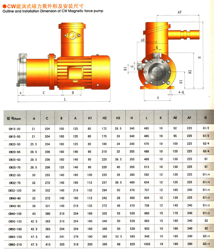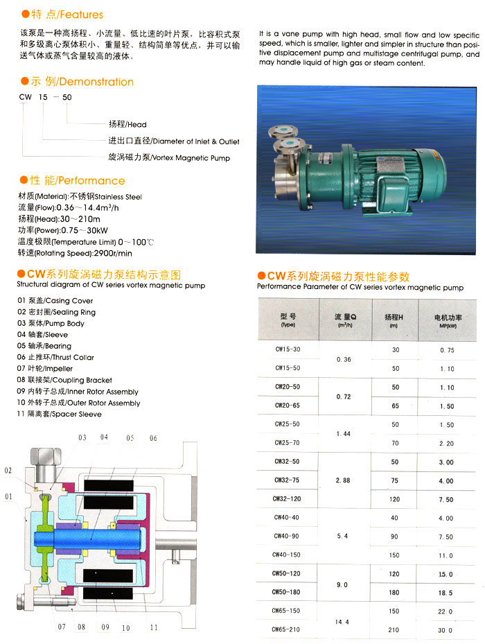 CW系列旋渦磁力泵 http://www.bjythy.com/cilibeng/2725.html 該泵是一種高揚程、小流量、比轉(zhuǎn)速低的葉片泵,比容積式泵和多級離心泵體積小、重量輕、結(jié)構(gòu)簡單等優(yōu)點,并可以輸送氣體或蒸氣含量較高的液體。